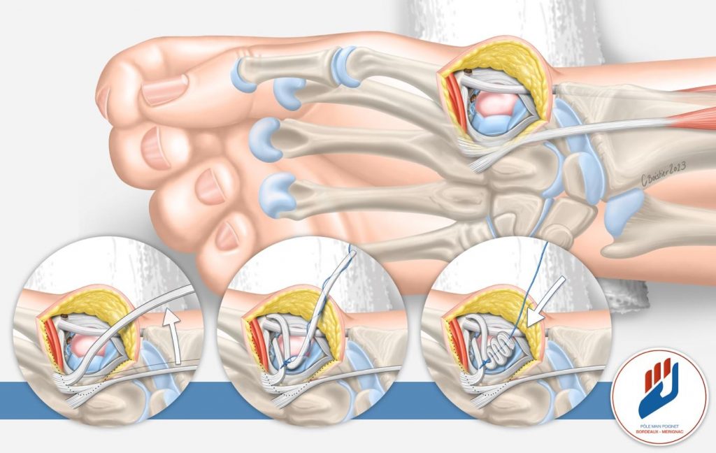 Lorsque la douleur persiste malgré un traitement médical bien conduit, une chirurgie peut être proposée. Le choix de la technique dépend de l’âge, du niveau d’activité et de l’état des autres articulations du poignet.